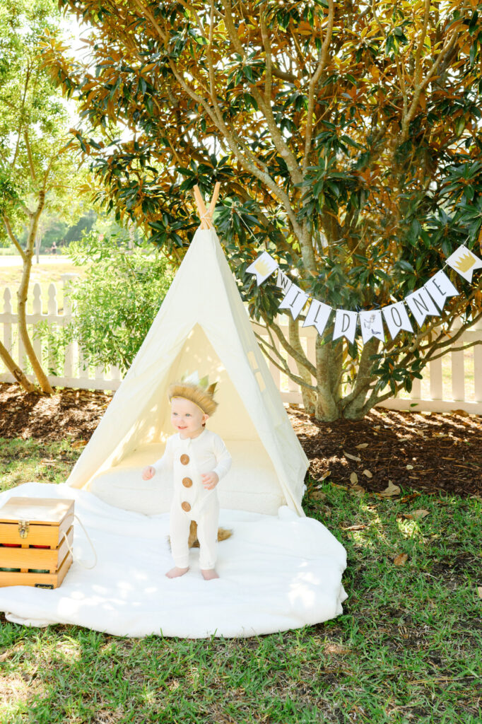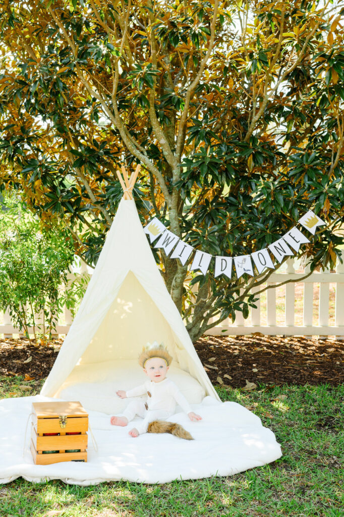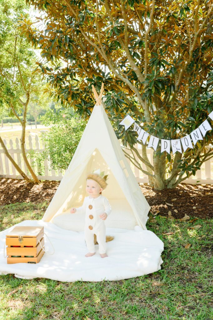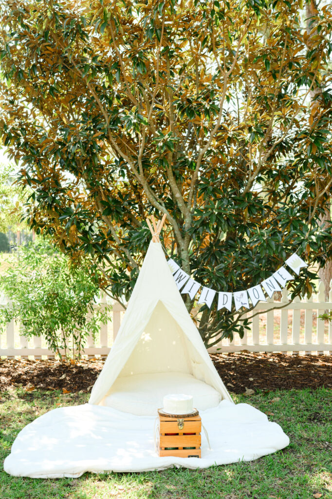 A “Wild One” banner or name sign instantly adds a celebratory feel to a birthday photos. Hang it above the tent or behind the cake table for a perfect backdrop.