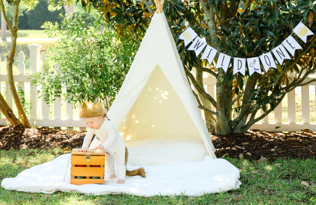 The scene felt like a forest adventure straight from Maurice Sendak’s illustrations. The tent became his little kingdom. The blanket served as his forest floor, and the rustic box a perch for his royal commands. While the book tells the story of Max sailing away to a land of wild things, Jack’s land was filled with curiosity and laughter.