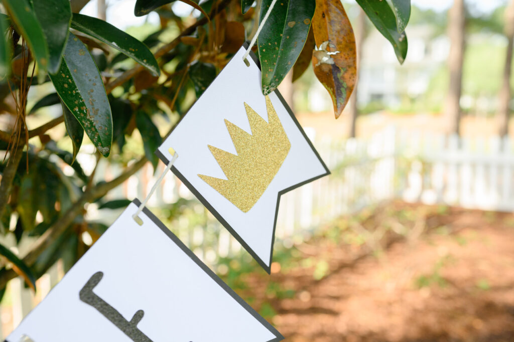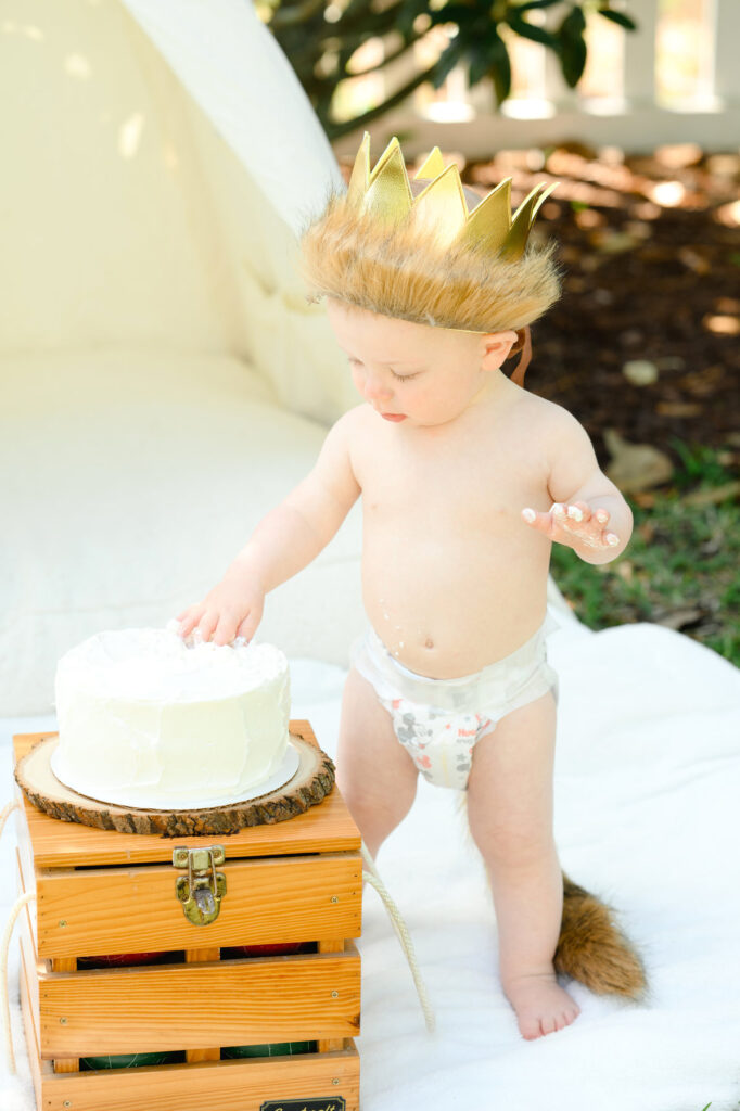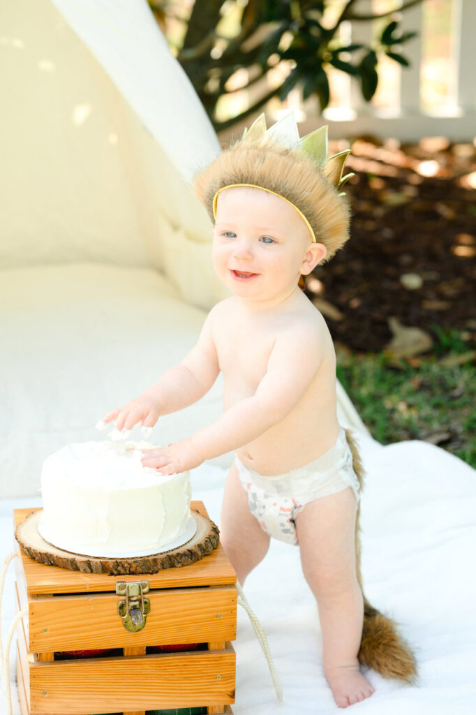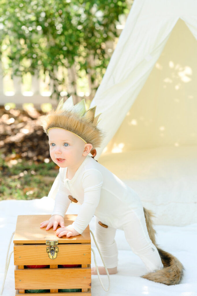 Jack wore the most adorable outfit, which immediately transported us into the pages of the book for his Where the Wild Things Are themed birthday photos. His white onesie had an attached tail, mimicking Max’s iconic wild suit. The soft golden crown was the perfect finishing touch, making him look every bit the mischievous and lovable king.